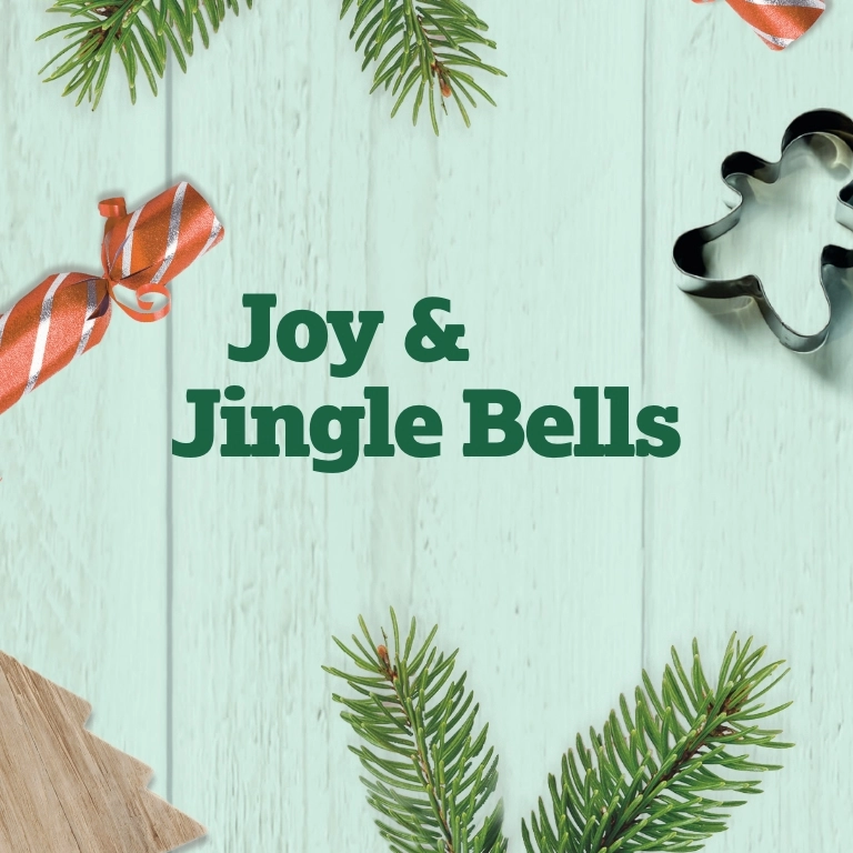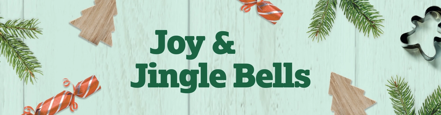 A banner showing the words "Joy & Jingle Bells" surrounded by Christmas crackers, pine tree sprigs, a wooden Christmas tree shape and a gingerbread person cookie cutter.